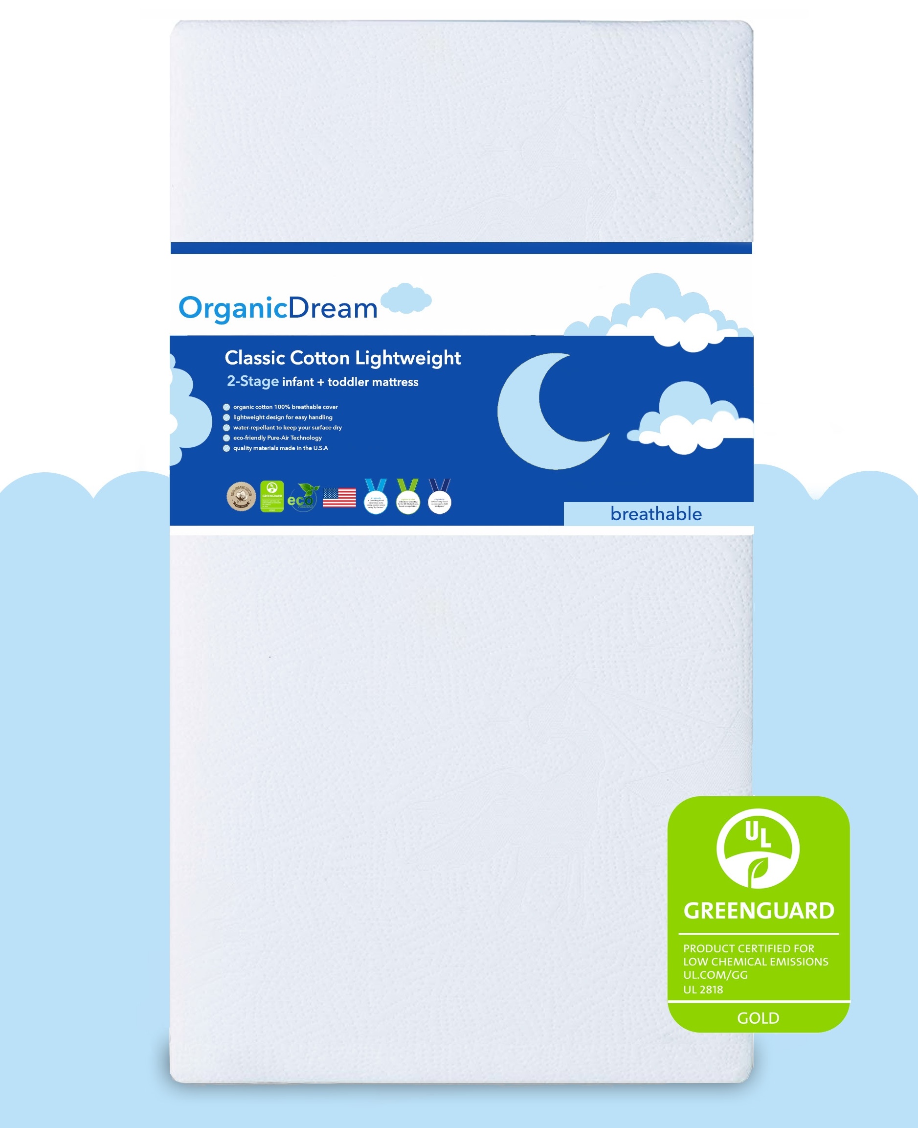 Mariah, Organic Dream customerThe best in infant sleep. This Breathable Classic 2-Stage Lightweight mattress is constructed from hypoallergenic organic cotton to provide comfort and premium support for your child. This 2-Stage mattress comes with an infant and toddler side to grow with your child. This product in Made in the United States with Organic Cotton.