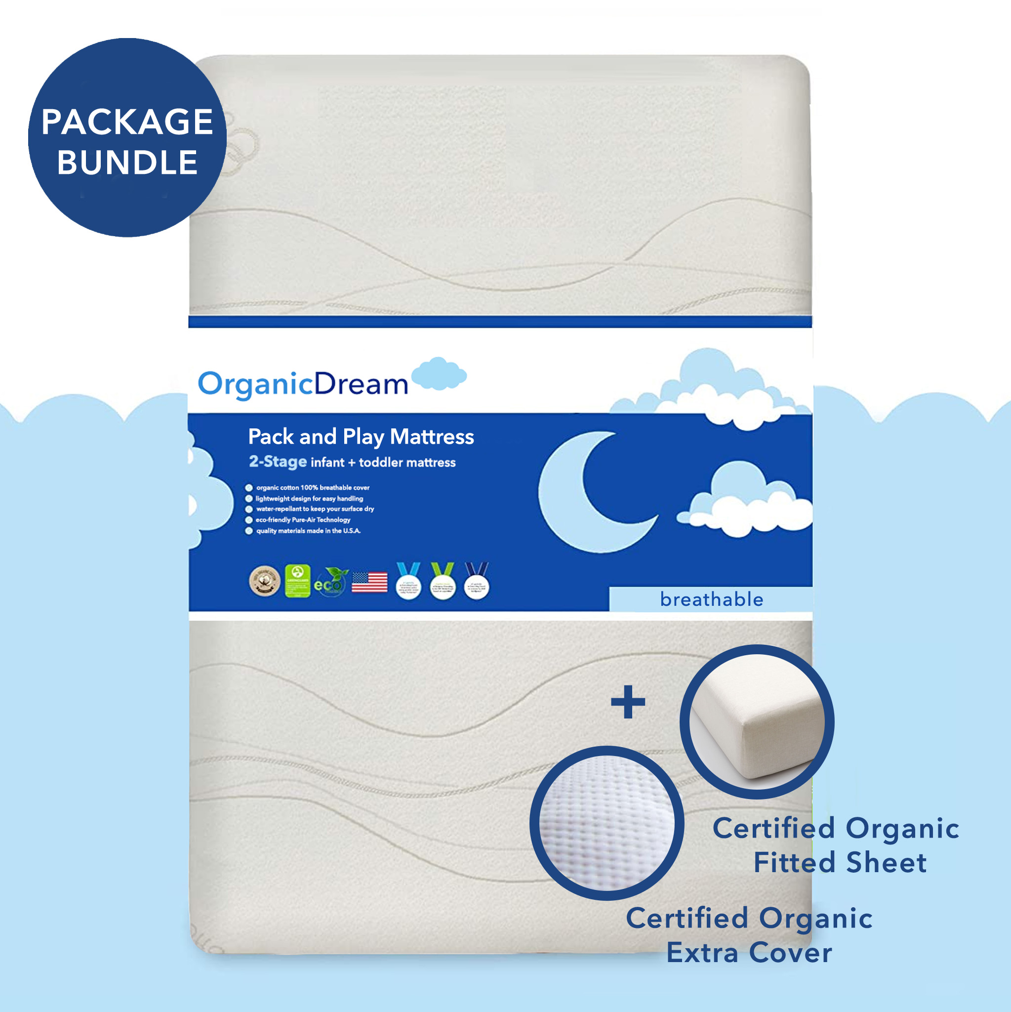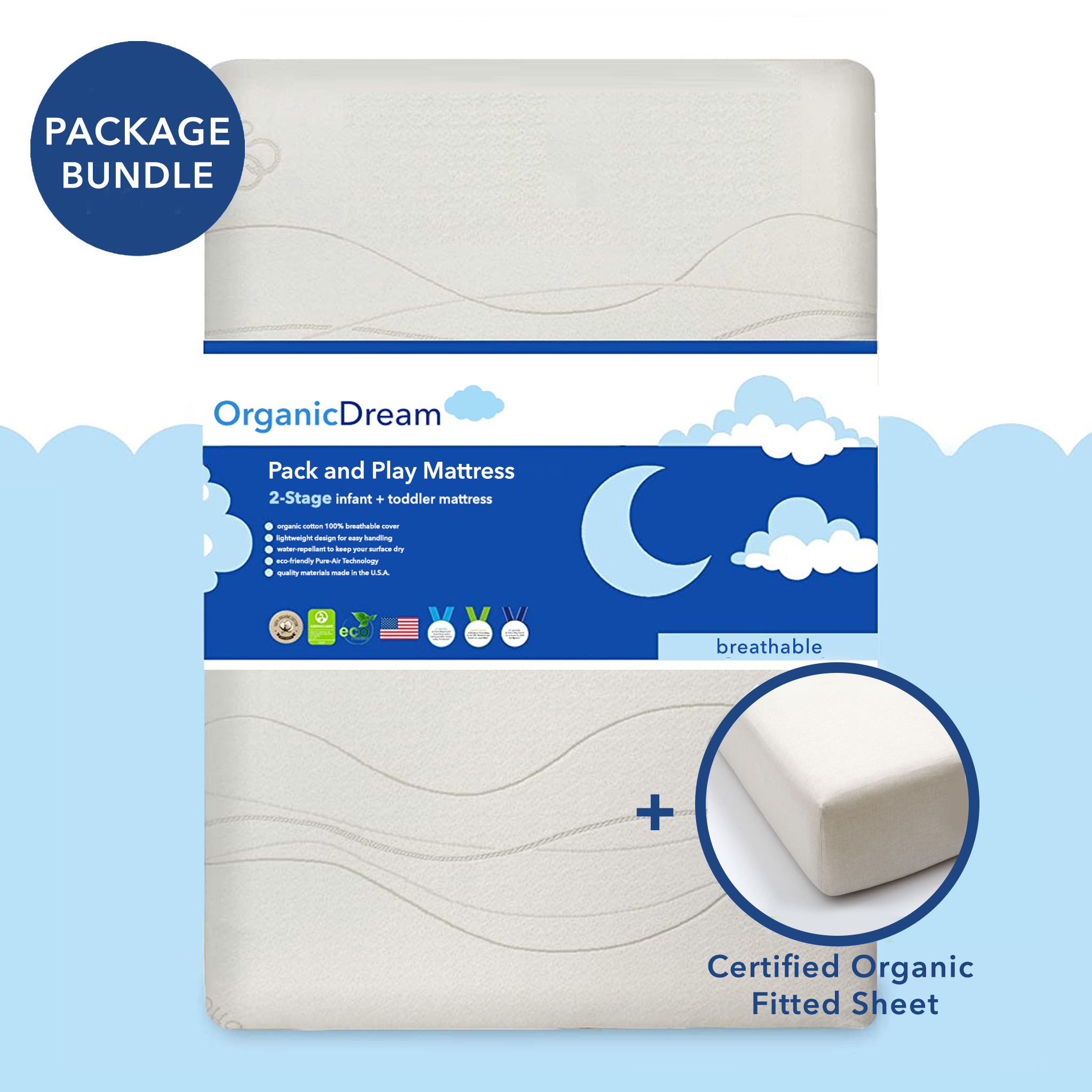 Kate, Organic Dream customerThe best in infant sleep. This breathable Pack and Play Mattress is constructed from hypoallergenic organic cotton to provide comfort and premium support for your child. This 2-Stage mattress comes with an infant and toddler side to grow with your child. This product in expertly crafted in the United States with Organic Cotton. Fits all standard 38" x 26" pack n plays and playards.