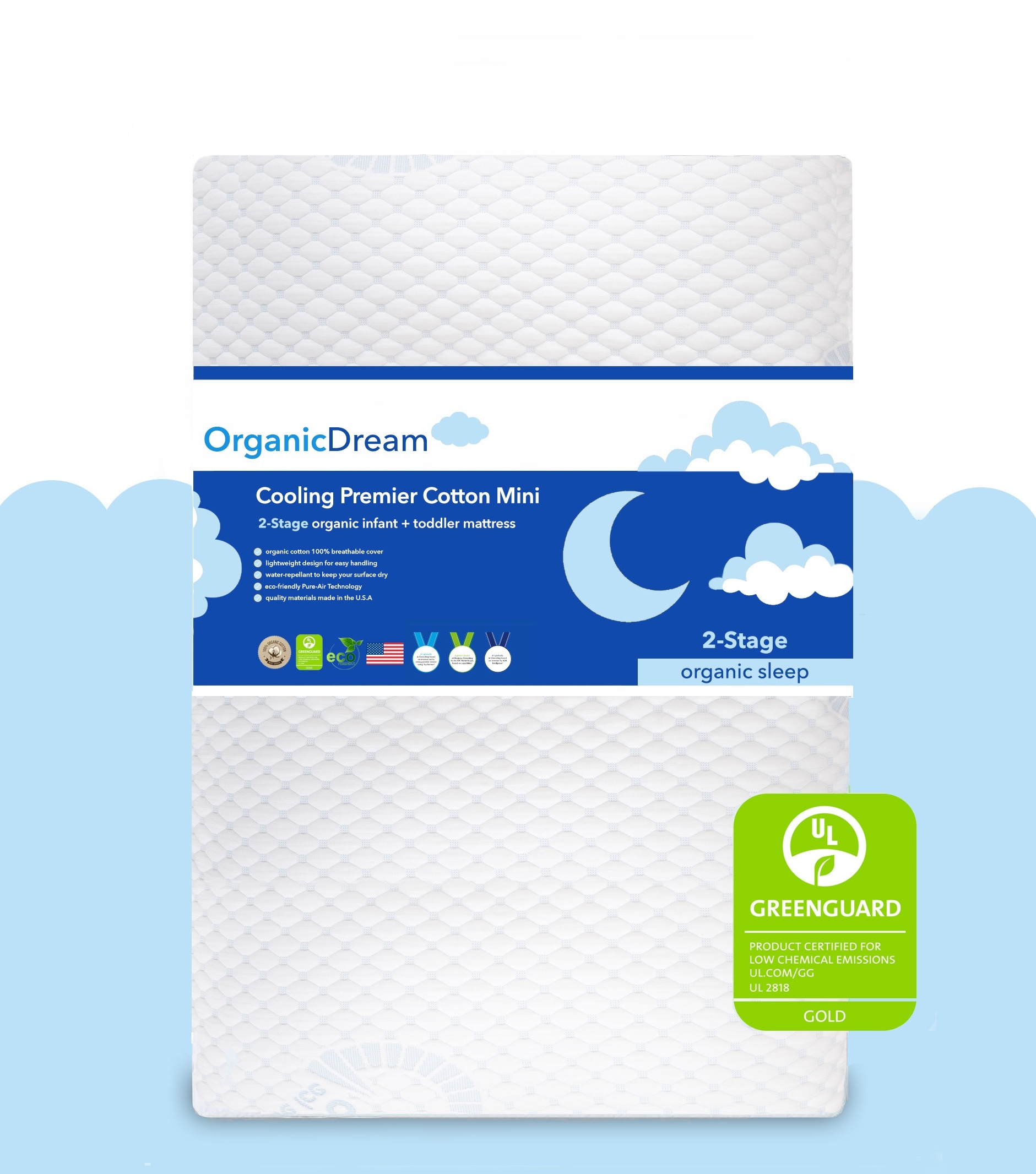 Mariah, Organic Dream customerThe best in infant sleep. This Cooling Premier 2-Stage Mini Crib Mattress is constructed from hypoallergenic organic cotton to provide comfort and premium support for your child. This 2-Stage mattress comes with an infant and toddler side to grow with your child. This product in Made in the United States with Organic Cotton.